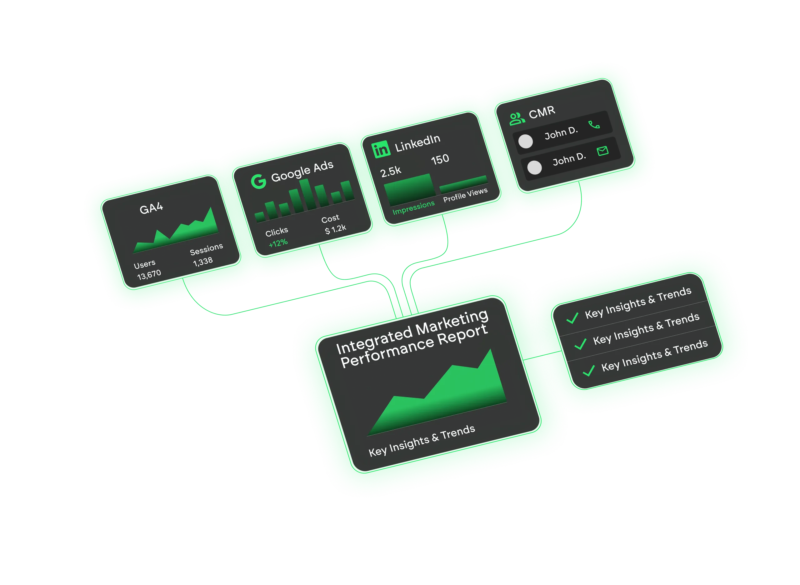 Reports that tell you what to do next. We read GA4, Google Ads, LinkedIn, and CRM data and send clear insights with actions.